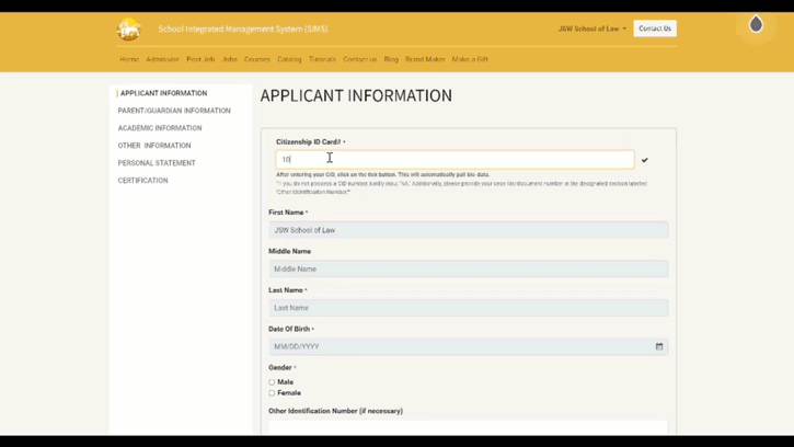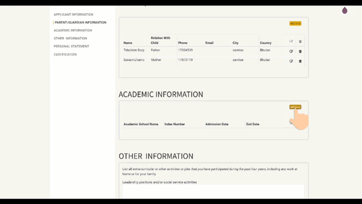In the Academic Information first, you need to add class 12 information and save it. Then click "add button" to continue adding degree information. If your university or college is missing from the drop-down menu, contact us at sar@jswlaw.bt.